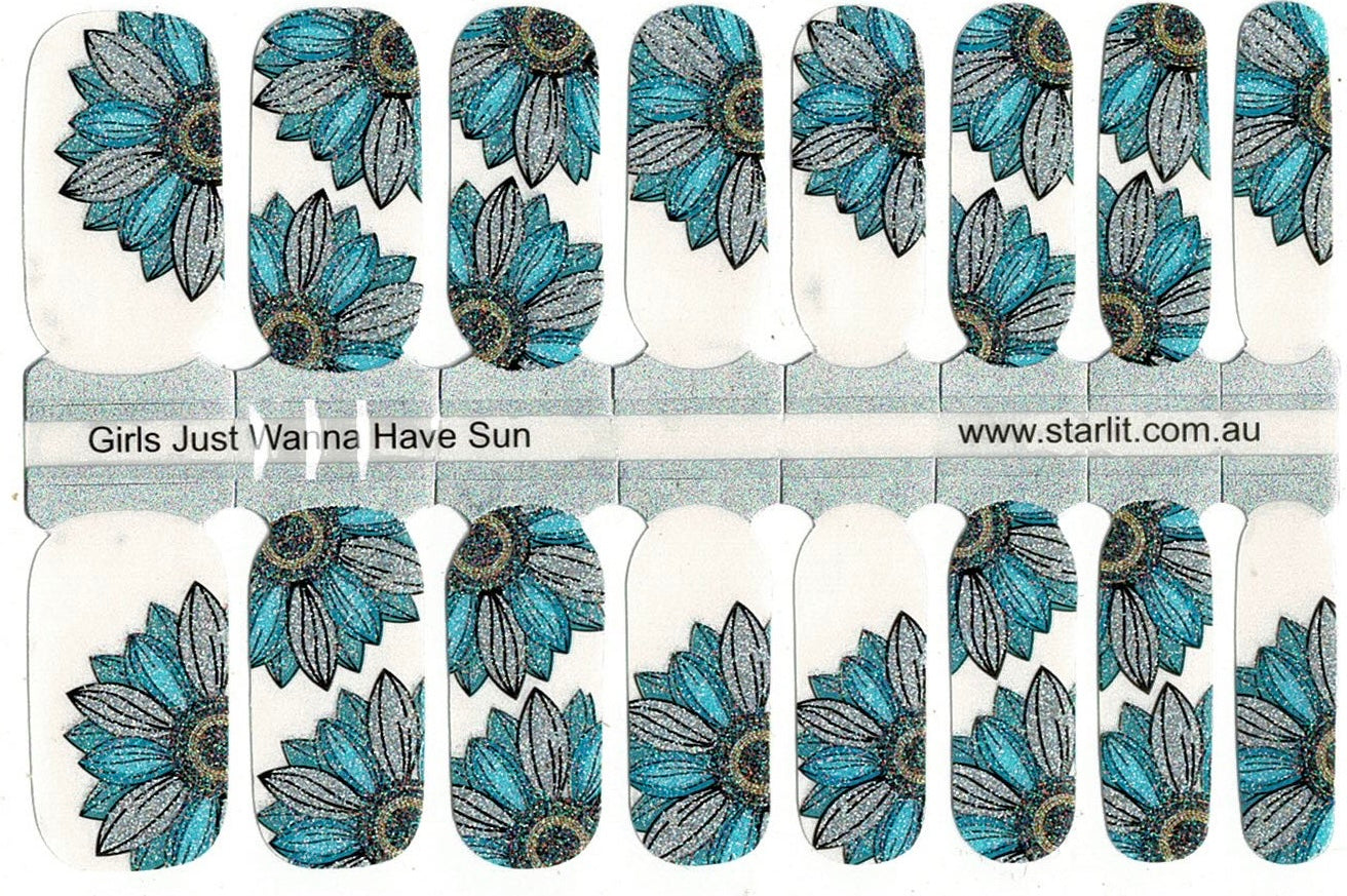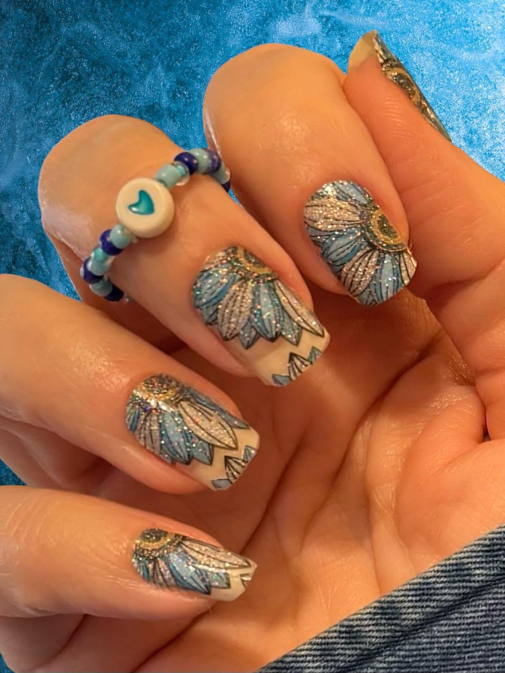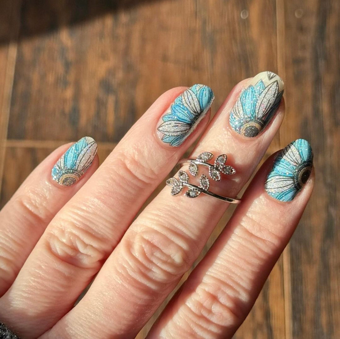 Explore the latest floral trends with the radiant charm of teal and silver sunflowers, ensuring your manicure blossoms with a touch of natural elegance and contemporary flair.
