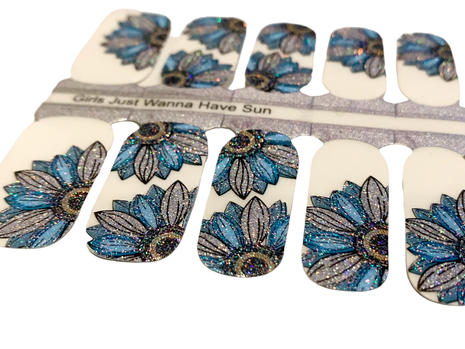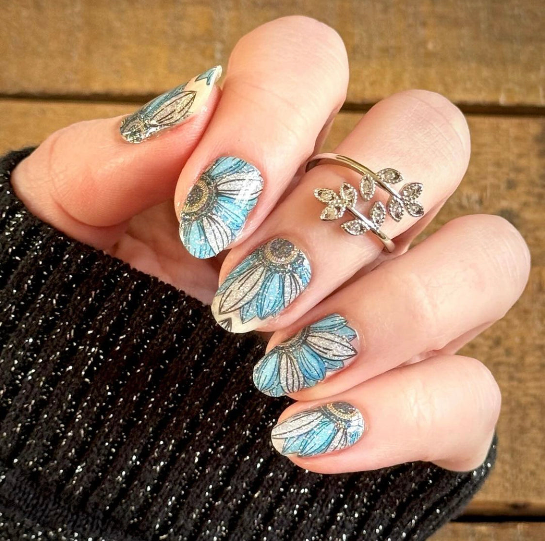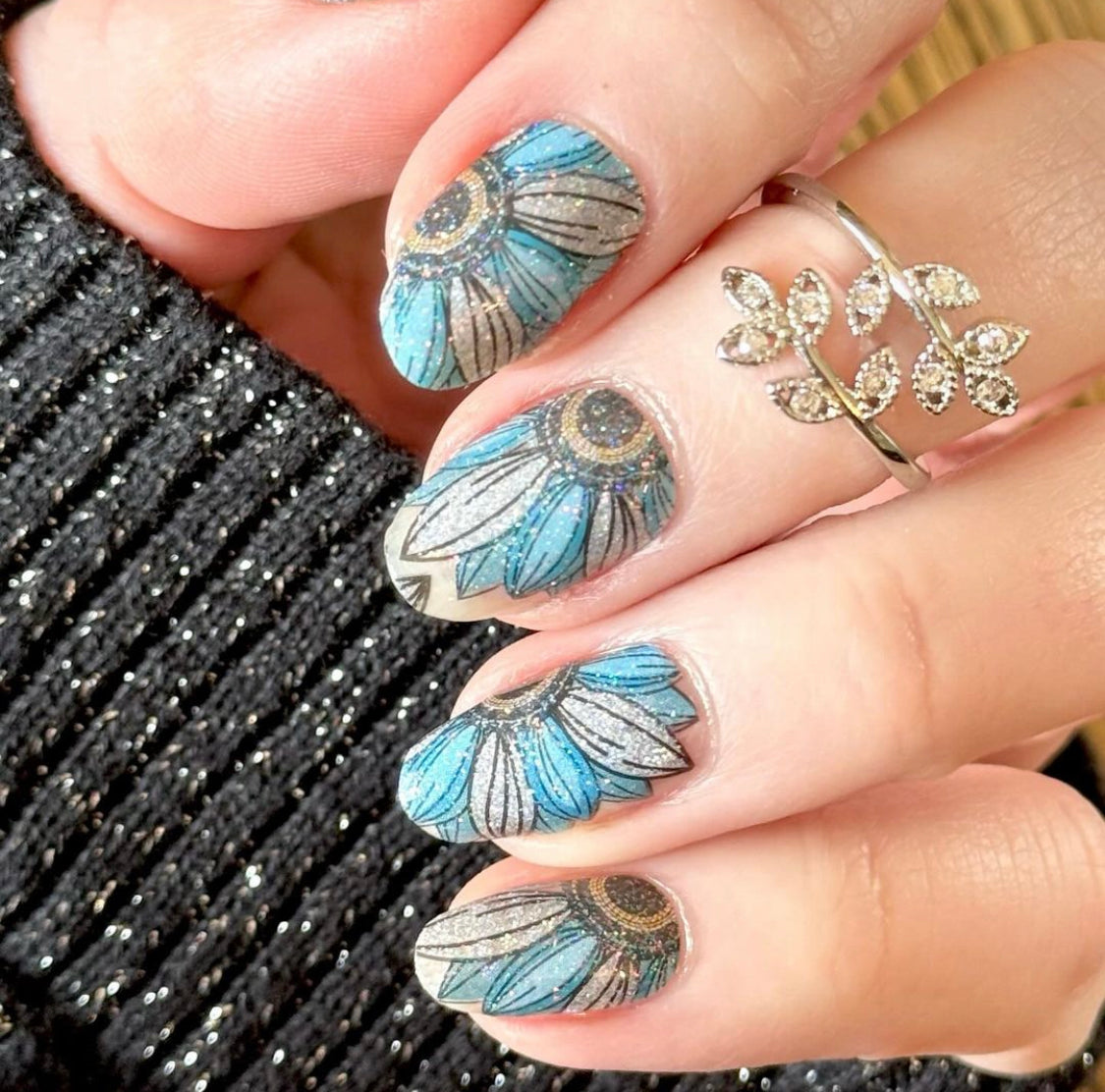 Explore the latest floral trends with the radiant charm of teal and silver sunflowers, ensuring your manicure blossoms with a touch of natural elegance and contemporary flair.