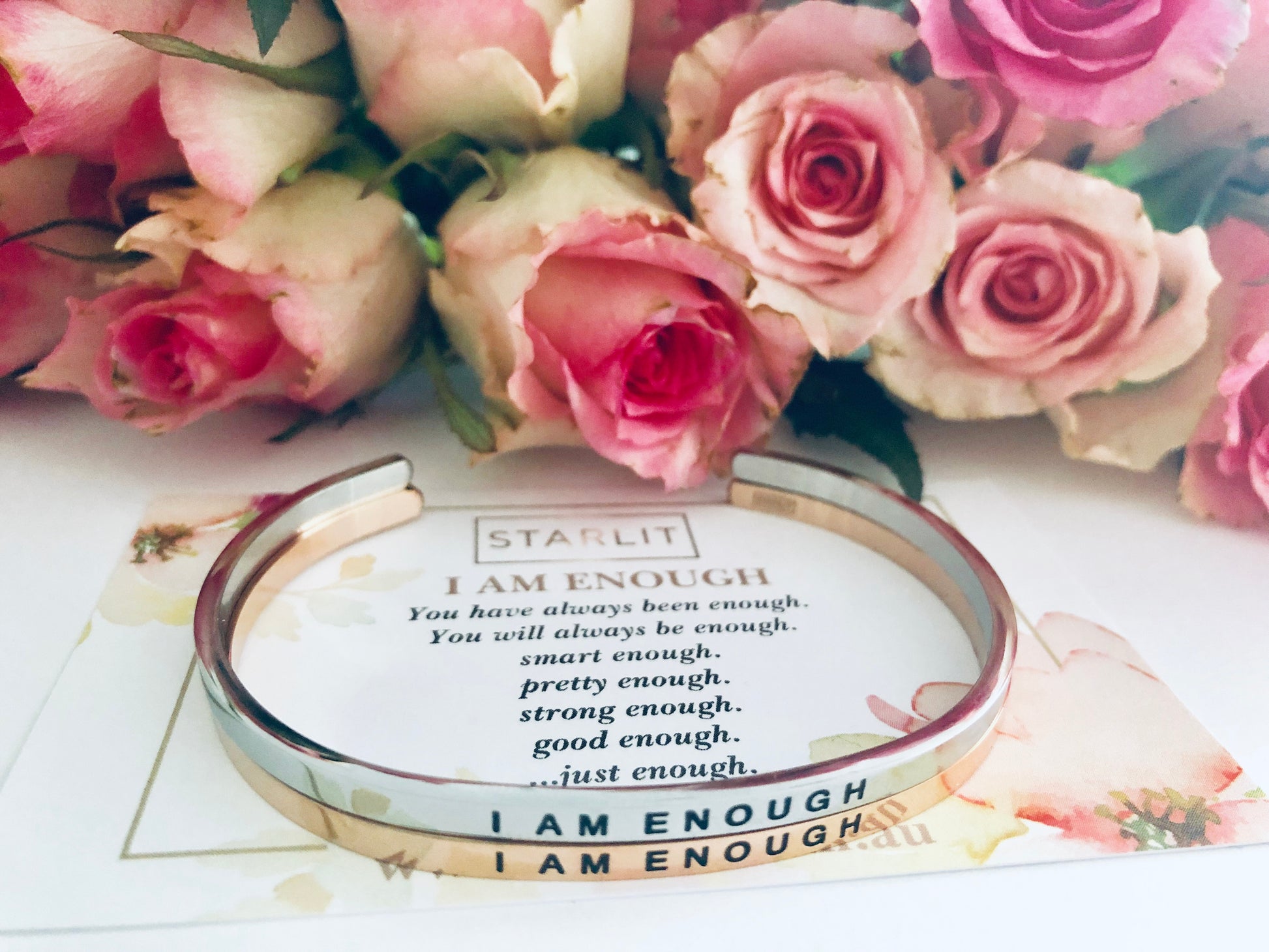 This bracelet is a reminder to tell yourself each and every day that you are enough just as you are at this moment in time! Block out that nagging little voice in your head that may be telling you anything otherwise, and say;