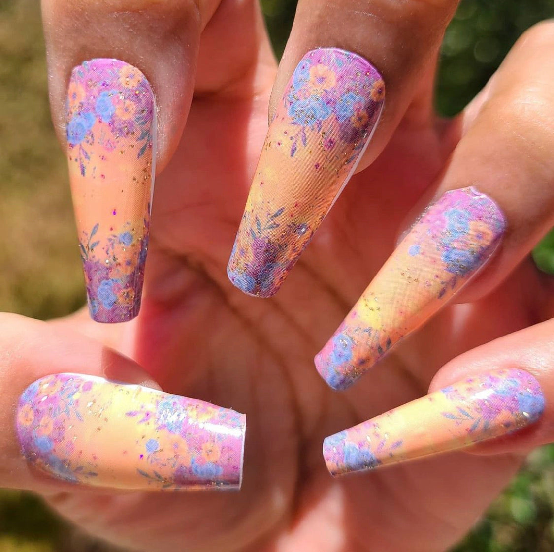 Finishes: Glossy with with sprinkles of purple and champagne glitter on the flowers